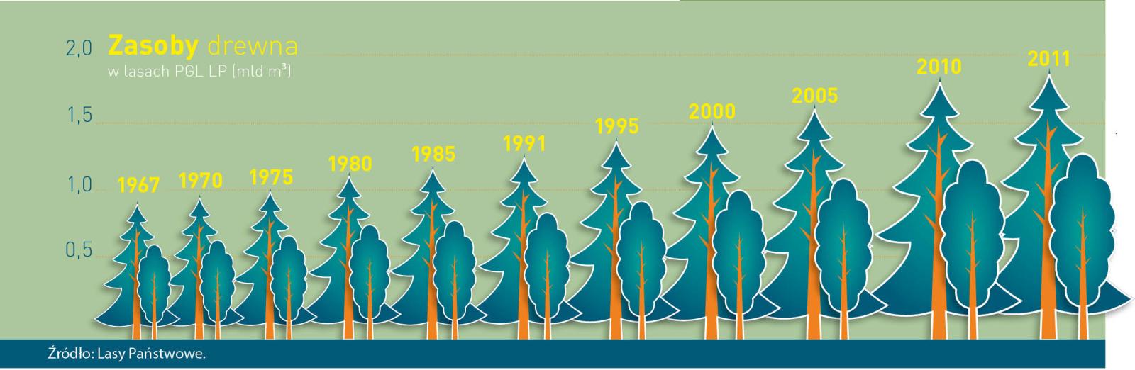 Stale rosnąca zasobność drzewostanów, a tym samym przyrastające zasoby drewna w Lasach Państwowych umożliwiają stopniowe zwiększanie jego pozyskania